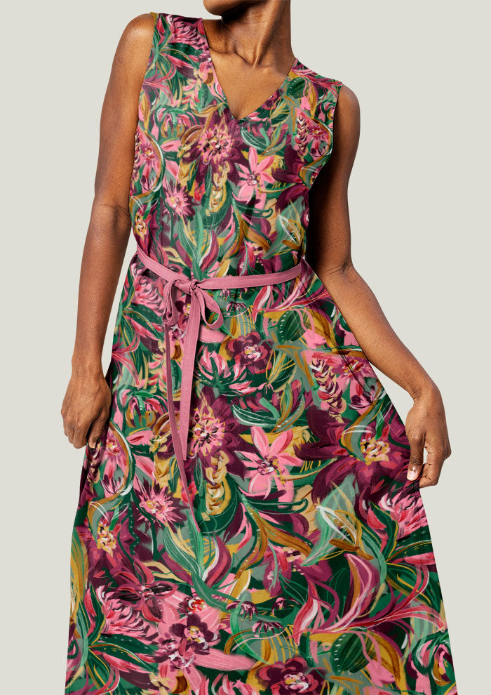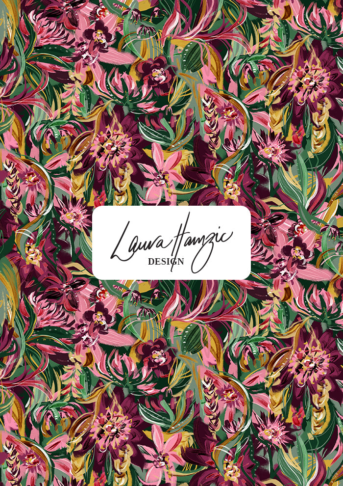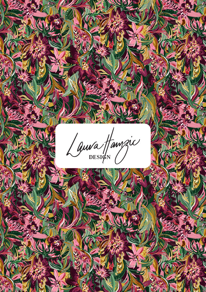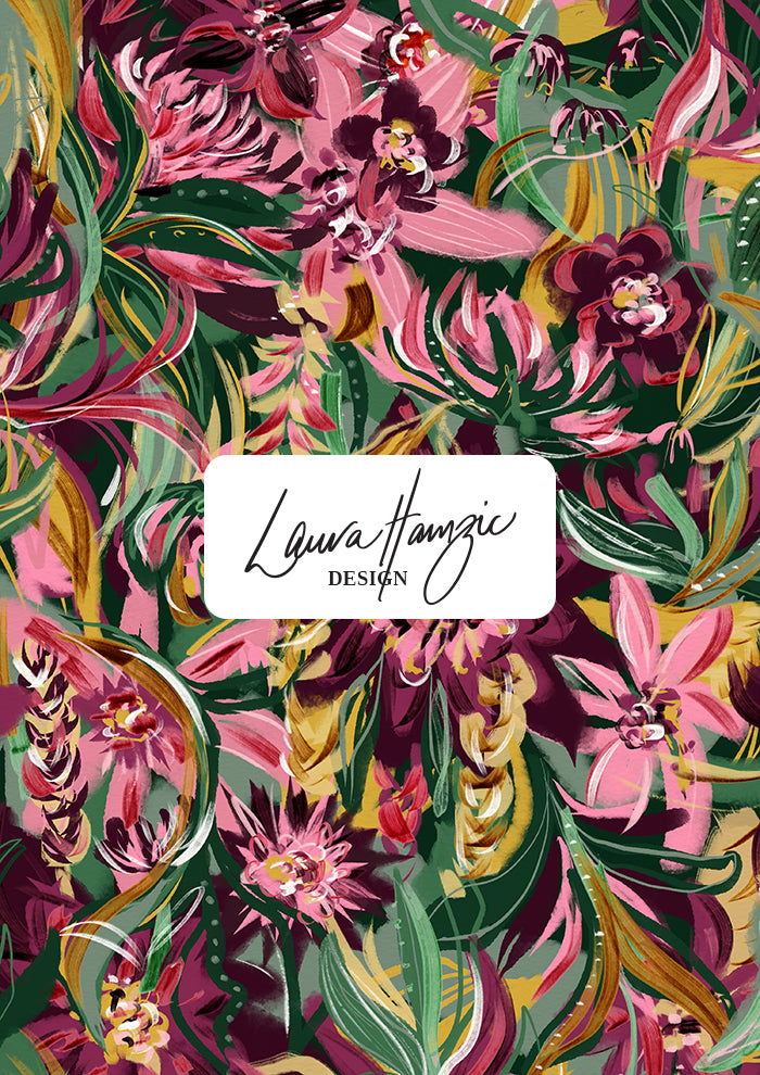 Midnight Bloom is a bold and expressive floral surface pattern design featuring rich, hand-painted botanicals. This high-impact print combines deep burgundy, magenta, blush pinks, golden ochre and layered greens to evoke the romance and drama of a garden in full bloom after dark. Lush flowers and sweeping leaves fill the space with movement and vibrancy, making it ideal for fashion, fabric, bedding, wallpaper, and statement homewares. The design’s full-coverage layout and painterly texture offer a luxurious, artistic finish, perfect for brands and makers looking to create standout products with an Australian twist. Whether you're designing summer apparel, packaging, or home textiles, Midnight Bloom adds a dramatic, nature-inspired statement. Available in multiple formats with licensing and recolour options through Laura Hamzic's pattern library.