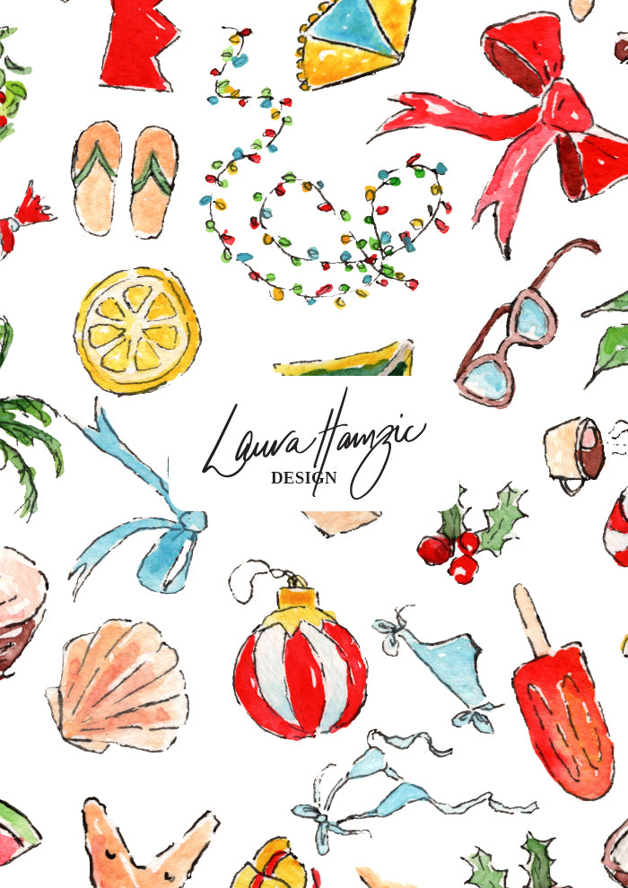 With a relaxed, hand-drawn style and soft painterly touches, this surface pattern design brings a warm-weather vibe and coastal cheer to your festive products. Perfect for sunny Christmas wrapping paper, matching christmas pjs for family, summery scrubs, beach accessories, and laid-back holiday merch.